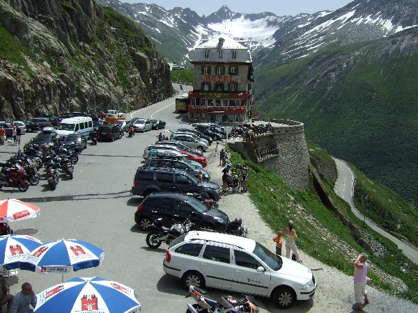 Zwei heftige Stunden nach dem letzten Bild ist es dann so gut wie geschafft, kanpp unterhalb der Passhöhe lockt das Hotel Belvedere mit massig Parkplätzen und überteuertem Futter - da muss ich mich leider als williges Opfer outen.