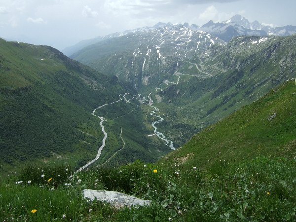 So, nochmal zum Mitschreiben: Mitte rechts schlängelt sich Gevatter Grimsel hoch, der Weg hier rauf aufm Furka ist dagegen gnädig vom Abhang verhüllt.